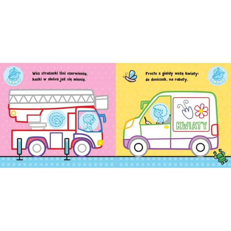 „Pojazdy na ulicy” to książeczka zaprojektowana tak, by bawić się z maluszkiem na wiele różnych sposobów: rozwijając jego umiejętności i uczyć czegoś nowego.