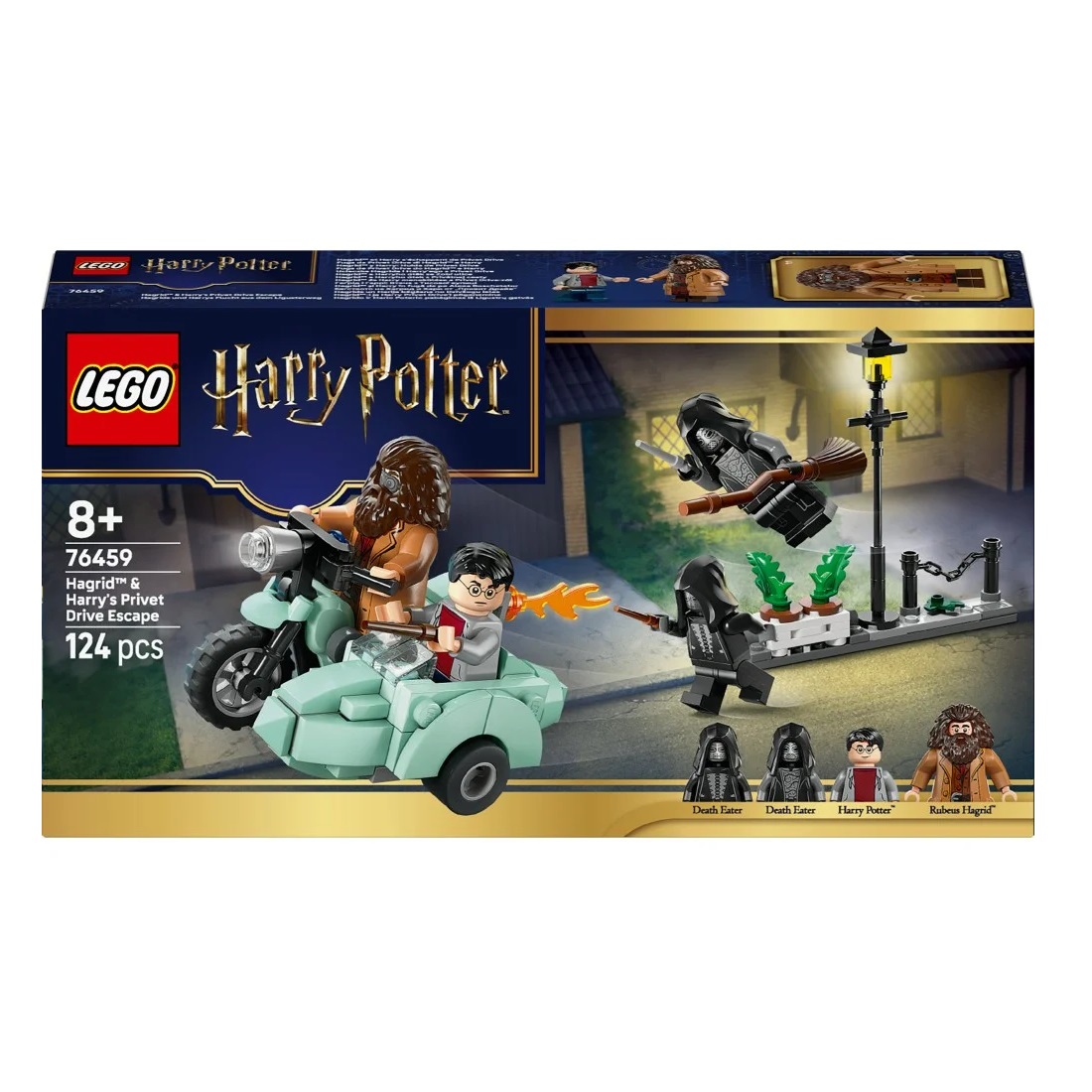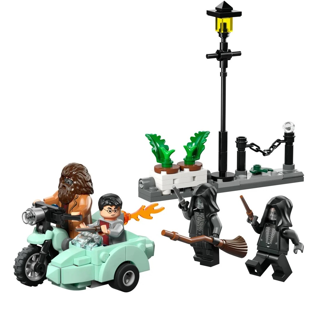 - Cztery minifigurki LEGO® Harry Potter™ — odgrywaj historie z Harrym Potterem, Rubeusem Hagridem™ (w charakterystycznych goglach motocyklowych) i dwoma śmierciożercami